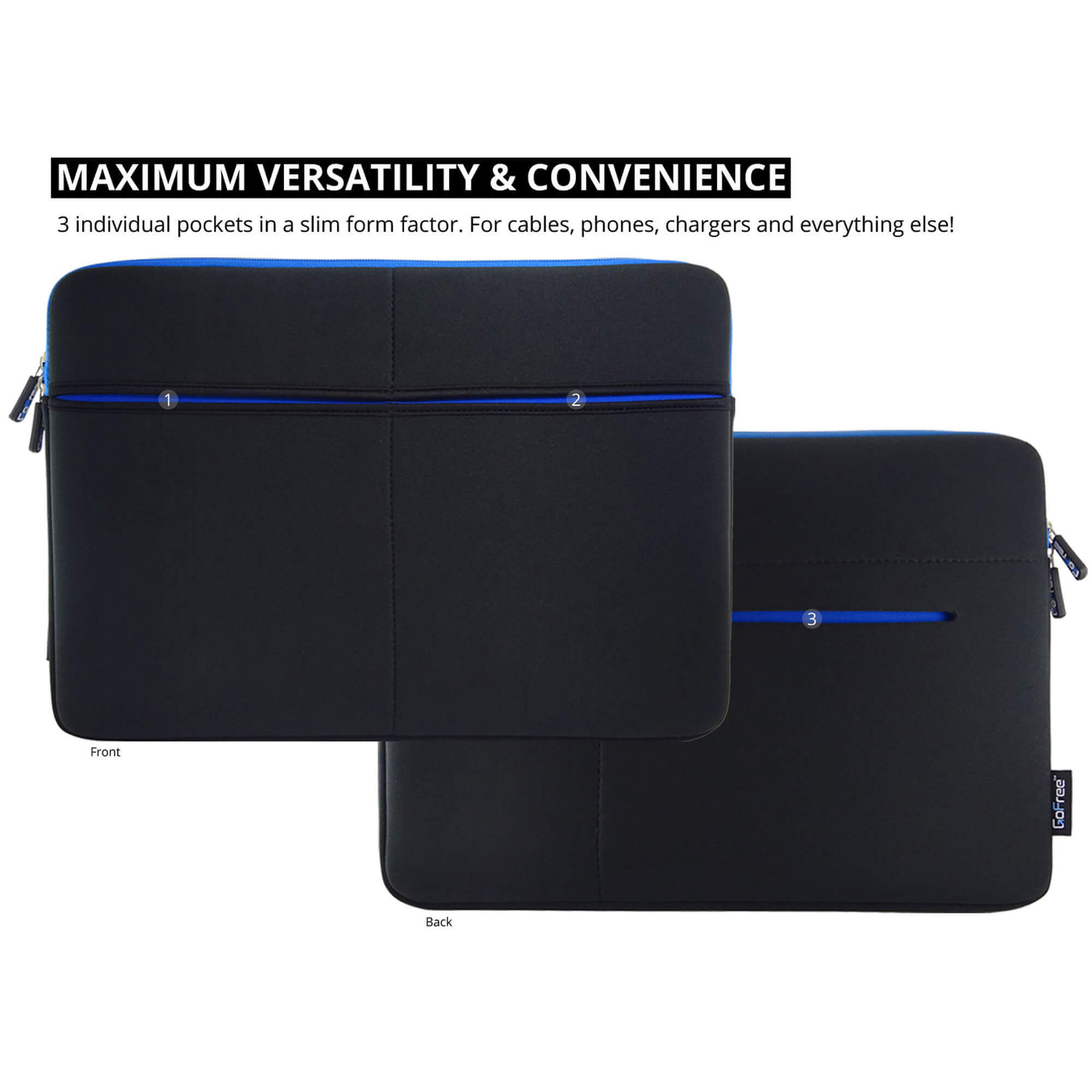The GoFree Slime Line 15 inch Laptop Sleeve is an super compact laptop sleeve which manages to pack in 3 additional sleeve pockets in its compact design. It fits most modern 15 and 15.6 inch laptops with ease.